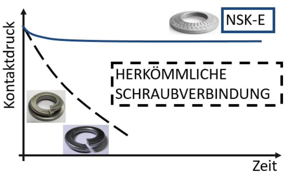 Die weiterentwickelte Verzahnung auf der Oberseite sorgt für einen Formschluss zum Schraubenkopf / Mutter. Dadurch können sich die Komponenten bei Querbelastung nicht losdrehen. Um zudem eine Beschädigung der weichen Verbindungspartnern zu vermeiden, weist die NSK-E an der Unterseite eine kufenartige Kontur auf. Im verschraubten Zustand liegt die Scheibe auf der Gegenlage auf, sodass trotz geringer Einbaugröße das Risiko der Überschreitung der Flächenpressung vermindert wird.